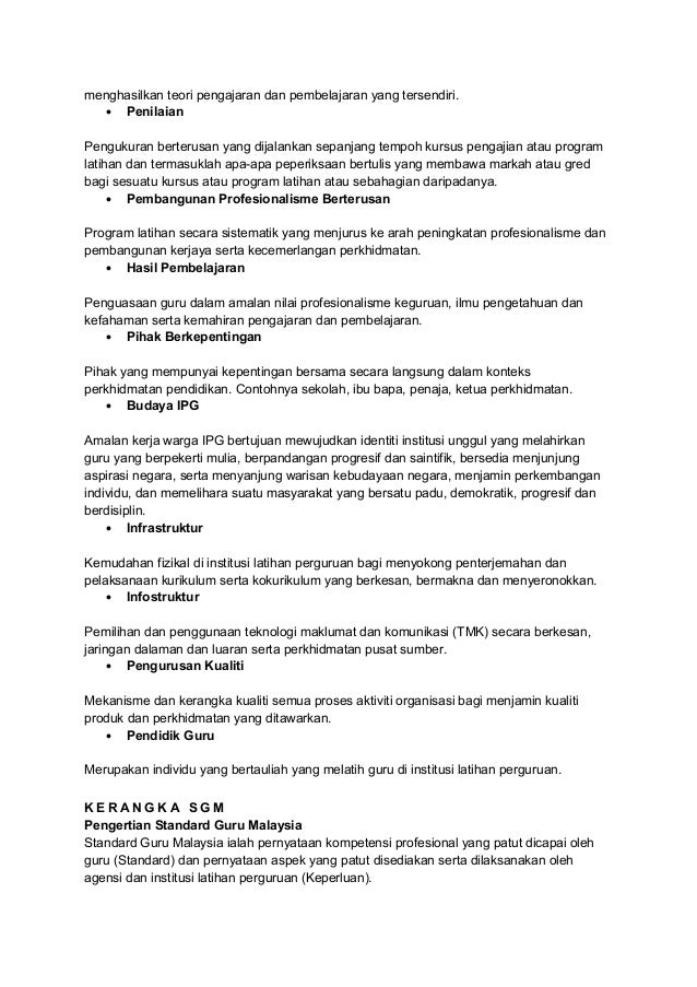 Penggubalan sgm adalah berasaskan kepada prinsip dan proses yang berikut: Dokumen ini disediakan sebagai panduan dan rujukan kepada guru, pendidik guru, agensi dan institusi latihan. S t a n d a r d g u r u m a l a y s i a ( s g m ) standard guru malaysia (sgm) menggariskan kompetensi profesional yang patut dicapai oleh guru, dan keperluan yang patut disediakan oleh agensi dan institusi latihan perguruan bagi membantu guru mencapai tahap kompetensi yang ditetapkan. Semua pelan strategik kebangsaan menekankan pendidikan dan pembangunan serta kemampanan modal insan untuk mencapai ekonomi berasaskan · guru perlu mempunyai tahap amalan nilai profesionalisme keguruan, pengetahuan dan kefahaman, serta kemahiran pengajaran dan pembelajaran yang tinggi bagi membolehkan mereka berfungsi sebagai guru profesional dengan berkesan,.